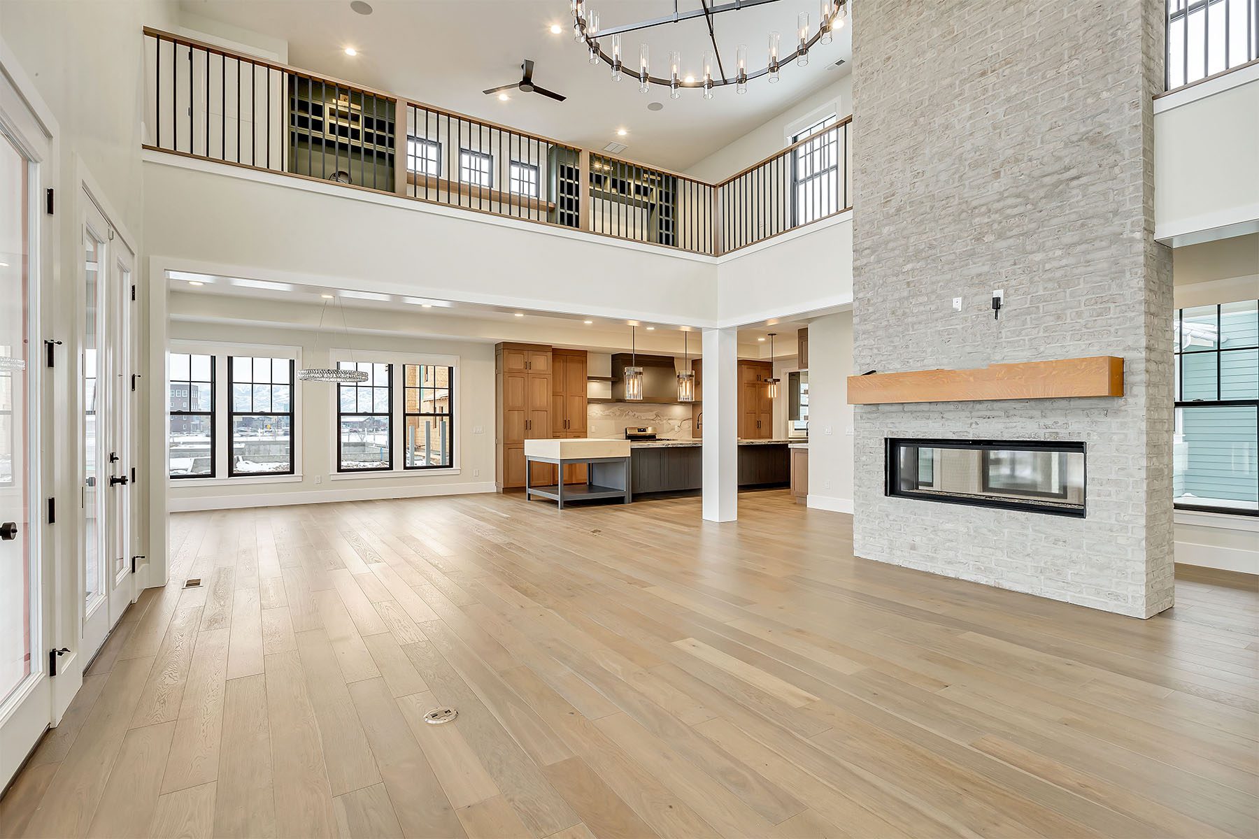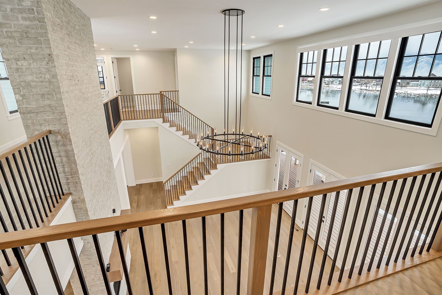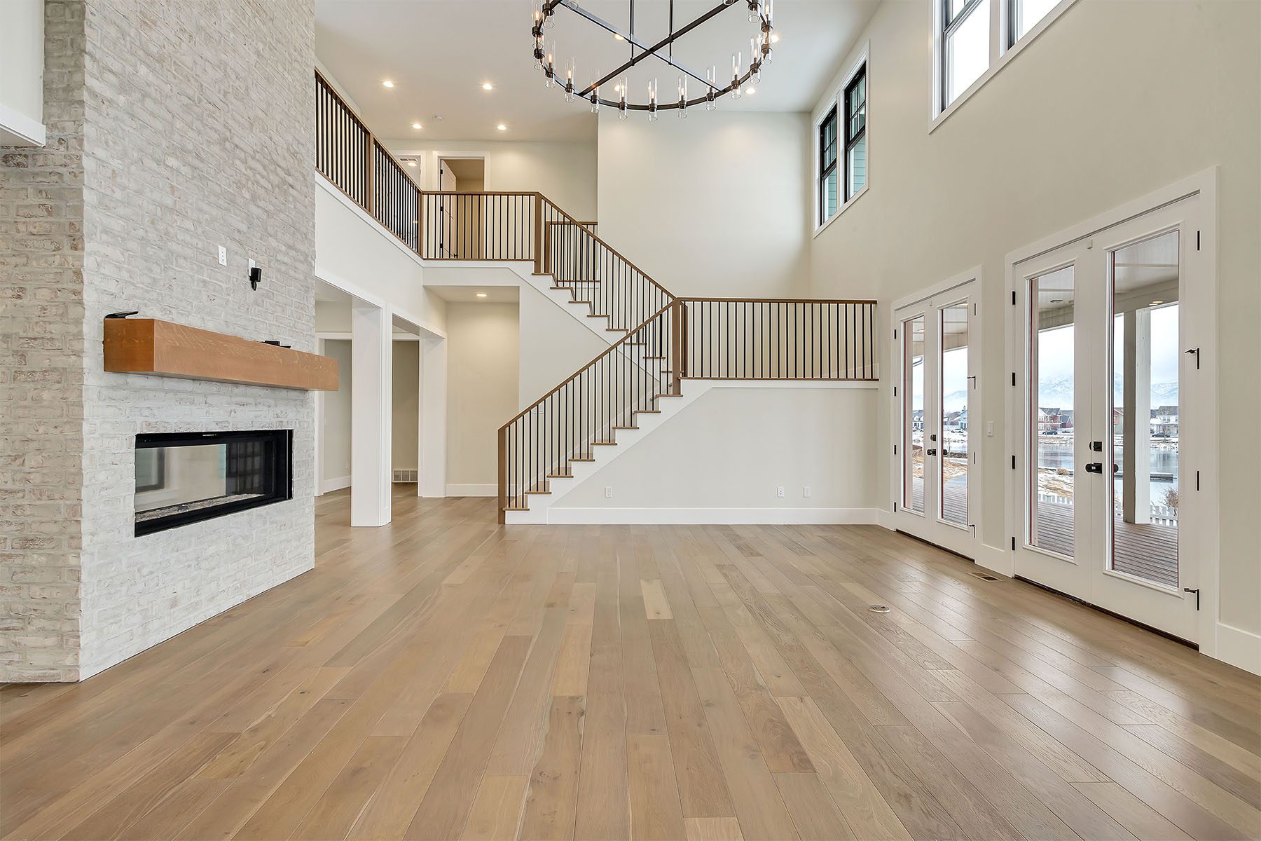 This luxurious home on the Island at Daybreak offers breathtaking lakefront views. The two-story great room is an awe-inspiring space, with a magnificent floor-to-ceiling brick fireplace that creates a warm and inviting atmosphere. The kitchen, with its spacious kitchen island, is both functional and stylish, including a convenient hidden pantry for additional storage. The master suite, located on the main floor, boasts a private patio with stunning lake views, as well as a large walk-in closet with a laundry area. The basement is a true entertainer's paradise, complete with a wet bar, a spacious rec room, a movie theater, and a gym for fitness enthusiasts. This home is adorned with elegant touches throughout, making it a one-of-a-kind, sophisticated residence.