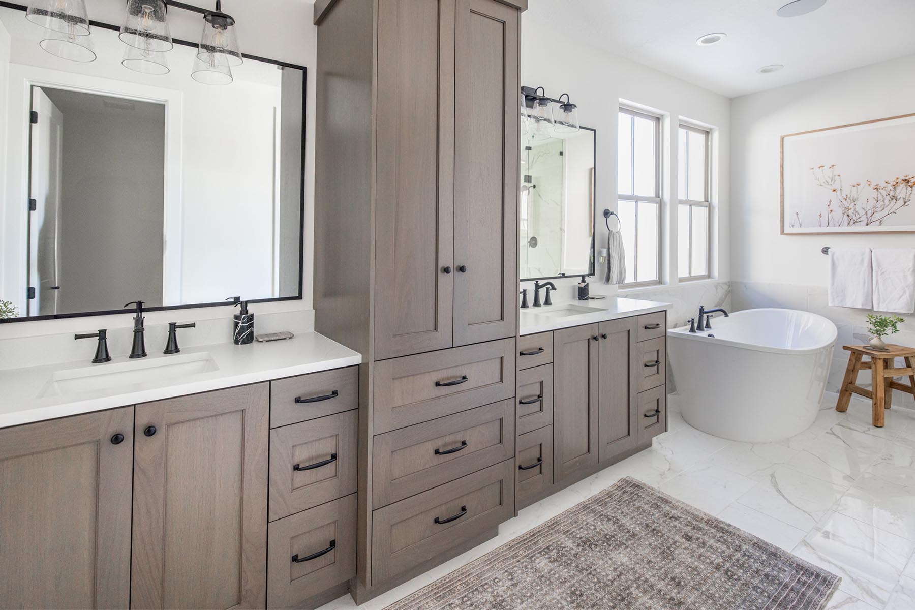 Vaulted primary suite with dual vanities, freestanding tub, shower, and huge walk-in